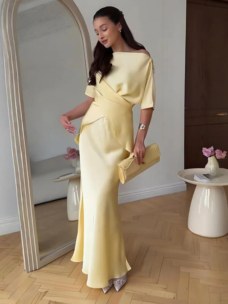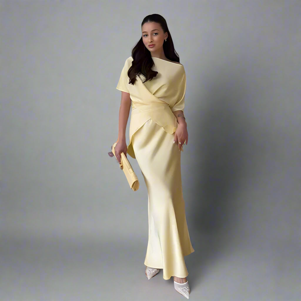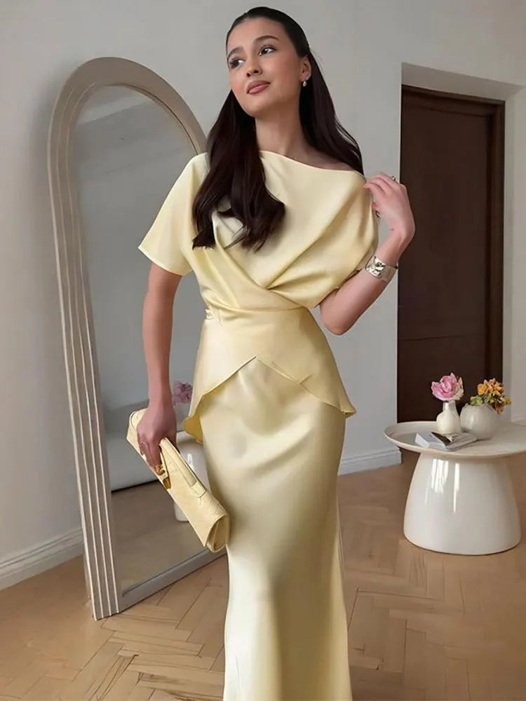 חליפת בקה הכוללת חצאית וחולצה באורך מידי בגזרה משוחררת ומחמיאה, עם מחשוף א-סימטרי ועיצוב קפלים עדין. עשויה מבד פוליאסטר קליל עם אלסטיות קלה לתחושת נוחות ורכות. שרוולים קצרים משלימים את הלוק לאאוטפיט אלגנטי ונשי.